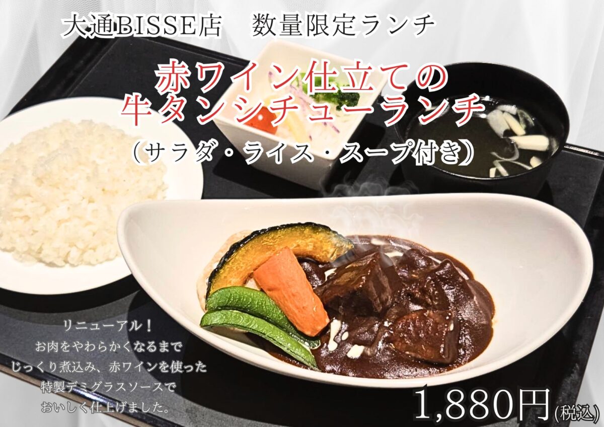 2026年1/16~ 牛タンおすすめ始まります。 BISSE 2026年1月12日 赤ワイン仕立ての牛タンシチューランチ 1880円 いつもご利用いただきありがとうございます。 1月16日㈮より、牛タンおすすめ2商品を販売致します!! ①ランチは赤ワイン仕立てのこだわりのやわらかく煮込んだ牛タンシチュー、 ⓶前菜やおつまみとしても楽しめる牛タンをじっくりと熱を入れることでしっとり、旨味を引き出した低温調理。 是非お召し上がりいただきたいです!! ご来店お待ちしております。